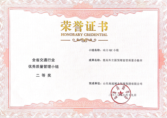 近日,山東高速城鄉(xiāng)發(fā)展集團QC小組活動項目成果《提高外立面預埋套管質(zhì)量合格率》由山東公路學會舉辦的全省“優(yōu)秀質(zhì)量管理小組”和“質(zhì)量信得過班組”評選,榮獲全省交通行業(yè)優(yōu)秀質(zhì)量管理小組二等獎。