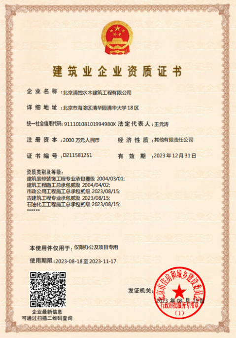 近日,北京清控水木建筑工程有限公司順利獲批“市政公用工程施工總承包貳級(jí)”、“古建筑工程專業(yè)承包貳級(jí)”及“石油化工工程施工總承包貳級(jí)”資質(zhì)。